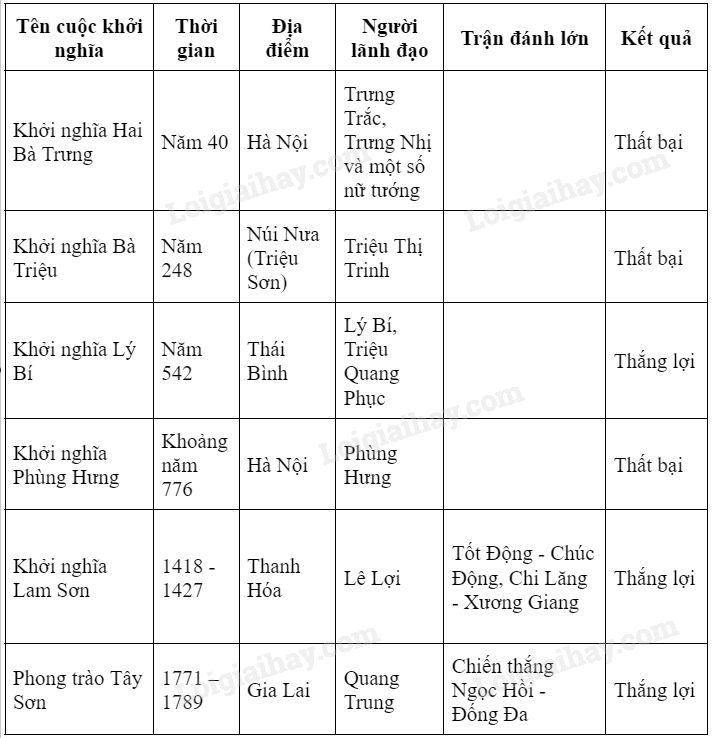 Hoàn thành bảng thống kê (theo gợi ý dưới đây) về nội dung chính của các cuộc khởi nghĩa diễn ra từ thế kỉ III TCN đến cuối thế kỉ XIX.