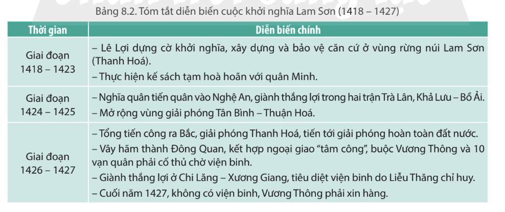 Quan sát Bảng 8.2 và Hình 8.3, nêu diễn biến chính và ý nghĩa của cuộc khởi nghĩa Lam Sơn.
