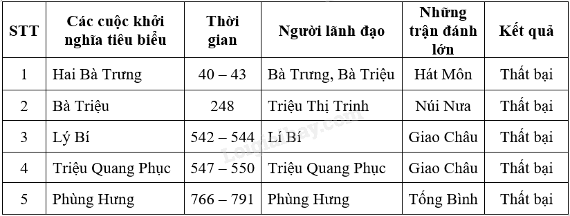 Hoàn thành bảng tóm tắt nội dung chính của cuộc khởi nghĩa tiêu biểu trong thời kì Bắc thuộc theo gợi ý bên: