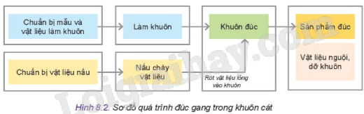 Quan sát Hình 8.2 và cho biết trước khi rót vật liệu lỏng vào khuôn đúc cần có các bước nào để xử lí vật liệu và khuôn?