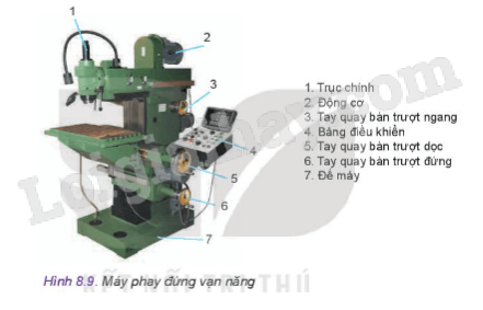 Quan sát Hình 8.9 và cho biết những bộ phận chính nào dùng để điều chỉnh chiều sâu và chiều rộng khi phay?