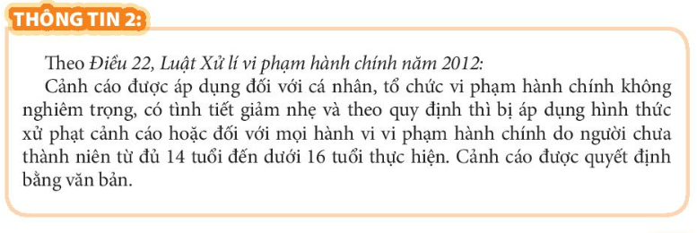 + Cảnh cáo được áp dụng đối với cá nhân, tổ chức vi phạm hành chính không nghiêm trọng, có tình tiết giảm nhẹ và theo quy định thì bị áp dụng hình thức xử phạt cảnh cáo hoặc đối với mọi hành vi vi phạm hành chính do người chưa thành niên từ đủ 14 tuổi đến dưới 16 tuối thực hiện.