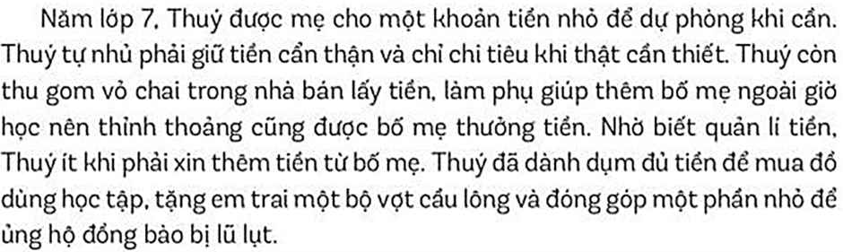 a) Việc quản lý tiền của Thúy rất hợp lí và khoa học. Thúy chỉ tiêu tiền cho những việc thực sự cần thiết và biết kiếm thêm tiền bằng những việc phù hợp với năng lực của bản thân.