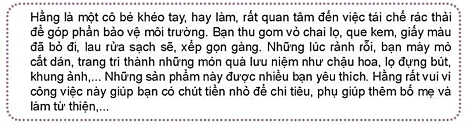 a) Việc làm của Hằng vừa giúp bạn kiếm thêm tiền phụ giúp bố mẹ và làm từ thiện, vừa giúp bảo vệ môi trường.