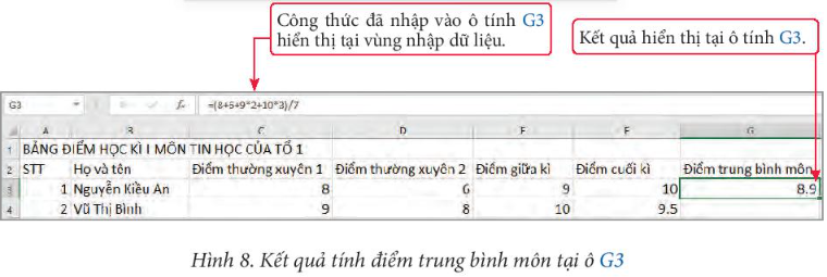 Sử dụng địa chỉ ô tính trong công thức để tính điểm trung bình Điểm thường xuyên 1 của tổ vào ô tính C9.