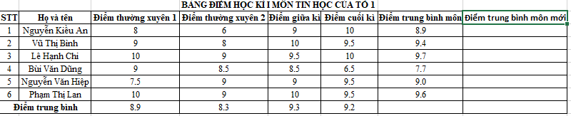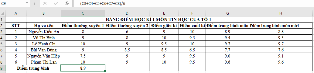 => Công thức để tính điểm trung bình Điểm thường xuyên 1 của tổ vào ô tính C9 là: = (C3+C4+C5+C6+C7+C8)/6