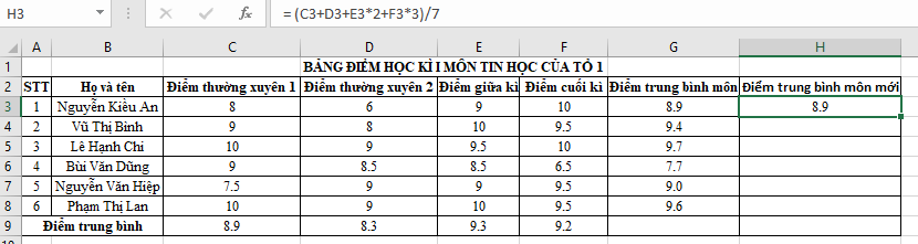 => Công thức tính điểm trung bình môn mới vào ô H3 cho bạn Nguyễn Kiều An là: = (C3+D3+E3*2+F3*3)/7