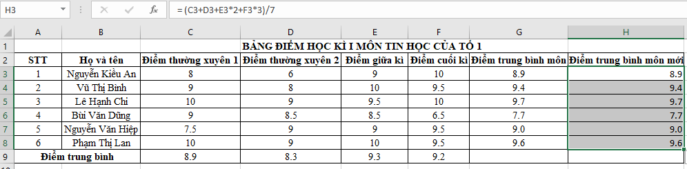 – Sao chép công thức tính Điểm trung bình môn mới của bạn đầu tiên ở ô tính H3 đến khối ô tỉnh H4:H8 để tính cho các bạn còn lại.