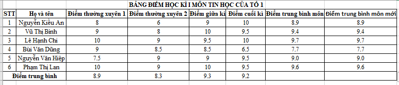 Lập bảng điểm dựa vào điểm thực tế của bản thân.