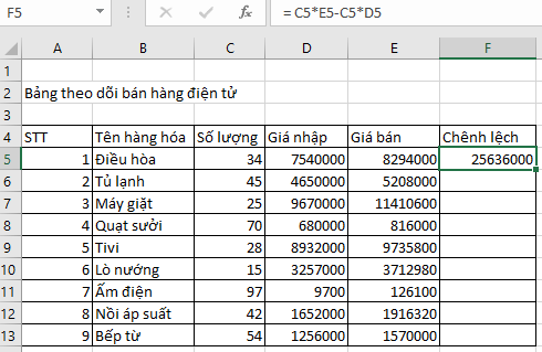 – Công thức tính số tiền chênh lệch của mặt hàng đầu tiên là: = C5*E5-C5*D5
