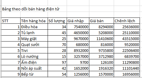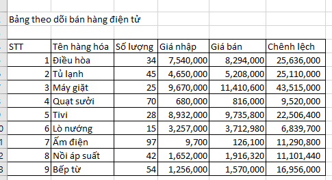 – Thực hiện định dạng dữ liệu có dấu ngăn cách hàng nghìn, hàng triệu cho các cột Giá nhập, Giá bán, Chênh lệch.