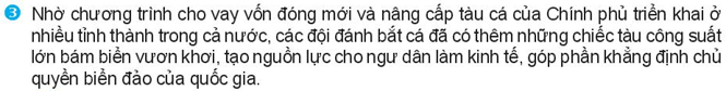 – Qua thông tin 3, ta thấy nhờ chương trình cho vay vốn đóng mới và nâng cấp tàu cá của Chính phủ triển khai ở nhiều tỉnh thành trong cả nước, các đội đánh bắt cá đã có thêm những chiếc tàu công suất lớn bám biển vươn khơi, tạo nguồn lực cho ngư dân làm kinh tế, góp phần khẳng định chủ quyền biển đảo của quốc gia.