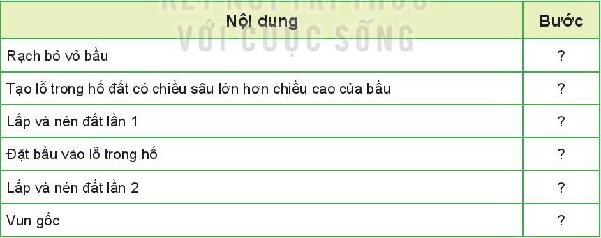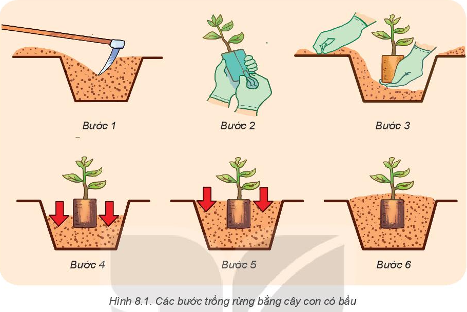 Quan sát Hình 8.1 và xác định các bước theo quy trình trồng rừng bằng cây con có bầu phù hợp với từng nội dung theo mẫu bảng dưới đây: