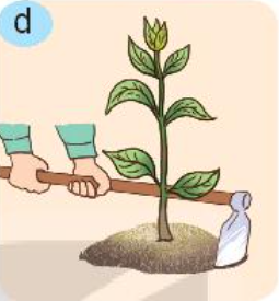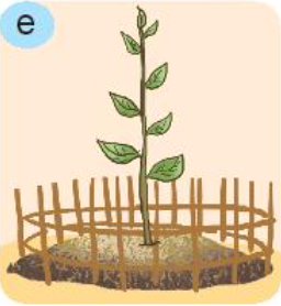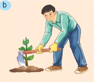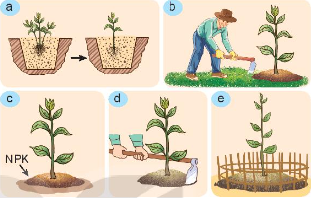 1. Sử dụng các cụm từ gợi ý sau đây để điền vào từng bước thích hợp trong Hình 8.2: đặt cây vào hố, đào hố trồng cây, nén đất, vun gốc, lấp đất kín gốc cây.