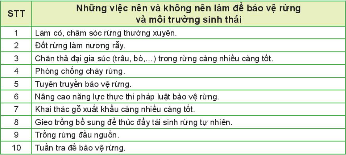 Chỉ ra những việc nên và không nên làm để bảo vệ rừng và môi trường sinh thái theo mẫu bảng dưới đây: