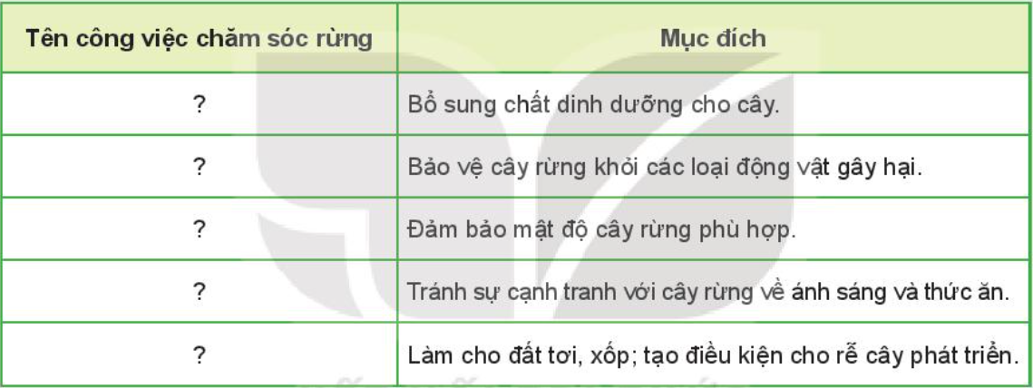 Hoàn thành vào vở tên công việc chăm sóc rừng theo mẫu trong bảng.