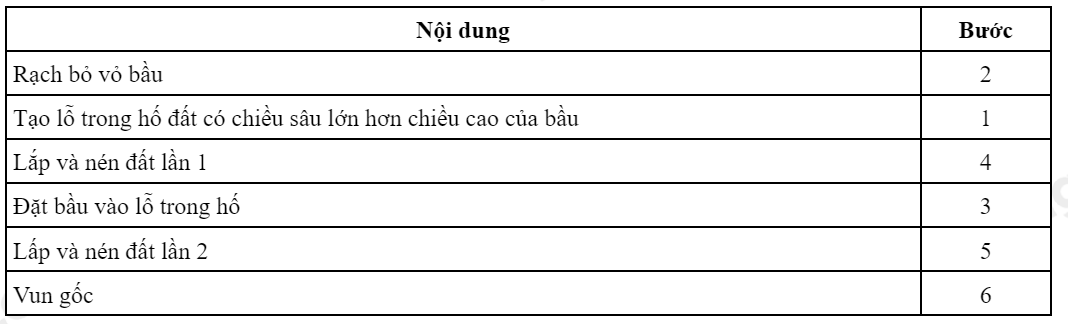 Tạo lỗ trong hố đất → Rạch bỏ vỏ bầu → Đặt bầu vào trong hố → Lấp và nén đất lần 1 → Lấp và nén đất lần 2 → Vun gốc.