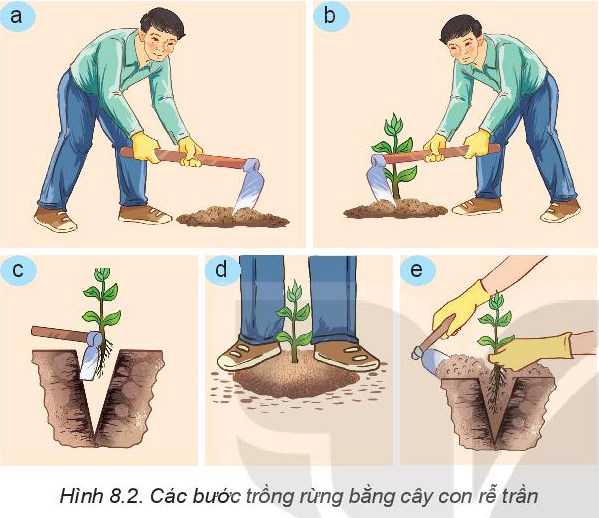 Sắp xếp các ảnh trong Hình 8.2 theo thứ tự các bước trong quy trình trồng rừng bằng cây con rễ trần.