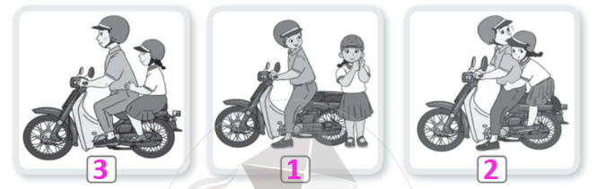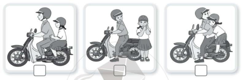 Viết số 1, 2, 3 vào ô □ dưới mỗi hình cho phù hợp với trình tự khi ngồi sau xe máy.