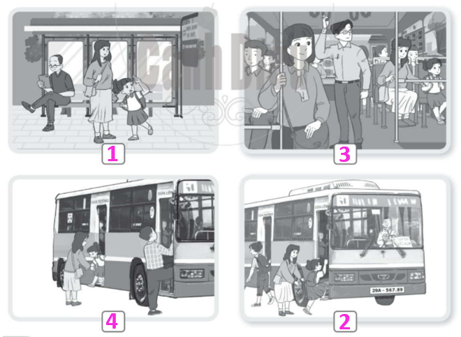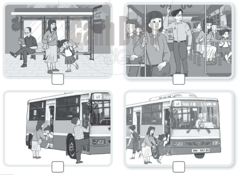 Viết số 1, 2, 3, 4 vào ô □ dưới mỗi hình cho phù hợp với trình tự khi đi xe buýt.