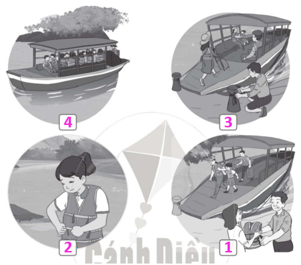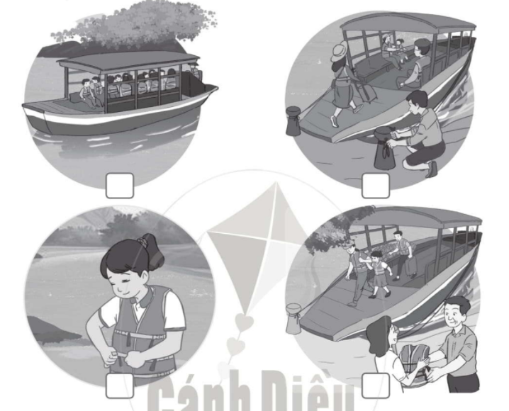 Viết số 1, 2, 3, 4 vào □ dưới mỗi hình cho phù hợp với trình tự khi đi thuyền.