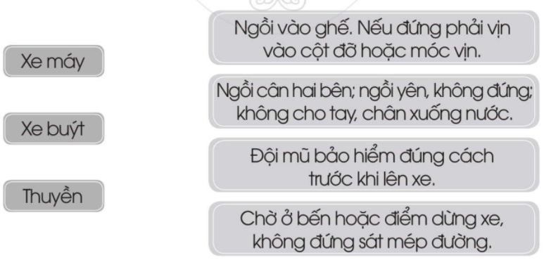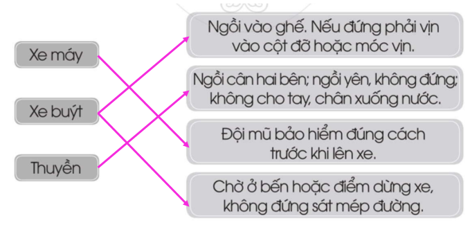 Nối tên phương tiện giao thông với quy định khi đi phương tiện giao thông đó cho phù hợp.