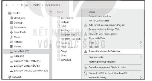 –  Chỉ với nhiệm vụ quét virus và các nguy cơ khác trên một thư mục thì cách đơn giản nhất là dùng File Explorer tìm thư mục đó. Sau đó nháy nút phải chuột, chọn chức năng Scan with Microsoft Defender…