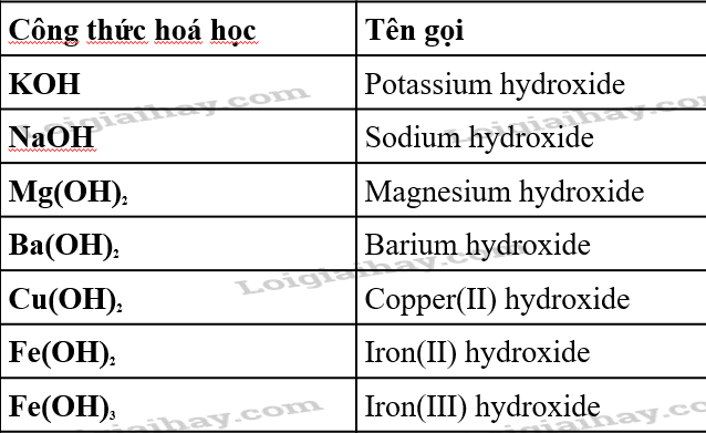 Câu hỏi trang 40:  Dựa vào bảng tính tan dưới dây, hãy cho biết những base nào là base không tan và base nào là base kiềm? Viết công thức hoá học và đọc tên các base có trong bảng.