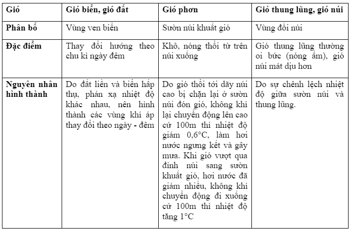 – Gió mùa thổi theo mùa, gồm gió mùa mùa đông và gió mùa mùa hạ. Hướng gió thổi ở 2 mùa trong năm ngược chiều nhau. Gió mùa mùa hạ thường có tính chất ẩm và gây mưa lớn, gió mùa mùa đông thường lạnh và khô.