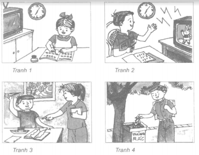 – Tranh 1: Bạn nữ tự giác ngồi vào bàn học bài khi đã đến giờ học.