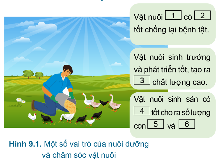 Gia đình em đã hoặc đang chăn nuôi loại vật nuôi nào? Hãy kể một số công việc trong nuôi dưỡng và chăm sóc vật nuôi đó. 1. Em hãy quan sát Hình 9.1 và chọn từ hoặc cụm từ thích hợp vào □ với Các cụm từ gợi ý sau: (a) khả năng sinh sản; (b) sức đề kháng; (c) nhiều; (d) sản phẩm; (e) chất lượng đàn con tốt; (g) khỏe mạnh.