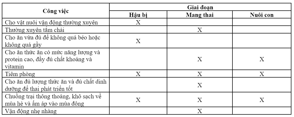 Phân tích bảng 9.2, ta thấy nuôi con cái sinh sản có thể chia làm ba giai đoạn: giai đoạn hậu bị, giai đoạn mang thai, giai đoạn nuôi con. TextDescription automatically generated