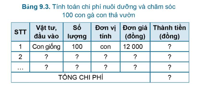 Để nuôi dưỡng và chăm sóc 100 con gà từ giai đoạn 1 ngày tuổi cho đến khi xuất bán (120 ngày tuổi) tại nông hộ đã có sẵn chuồng nuôi nhưng cần thêm chất độn chuồng hết 100 000 đồng/lứa, cần dùng 550kg thức ăn hỗn hợp; đủ loại thuốc thú y và vaccine cần thiết, trung bình 5000 đồng/con; tiền điện, nước trong 1 tháng khoảng 100 000 đồng; chi phí khác khoảng 450.000 đồng/lứa. Biết giá gà con giống 12 000đồng/con, thức ăn giá 10.000 đồng/kg. Hãy tính toán chi phí nuôi 100 con gà trên theo mẫu Bảng 9.3.