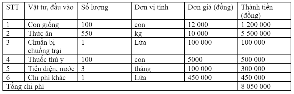 Tổng chi phí = Chi phí con giống + Chi phí chuẩn bị chuồng trại + Chi phí thức ăn + Chi phí thuốc thú y + Chi phí điện, nước + Chi phí khác.