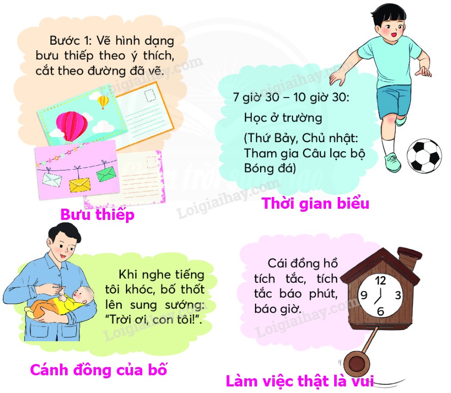 Em xem lại các bài đọc Bưu thiếp, Thời gian biểu, Cánh đồng của bố, Làm việc thật là vui.