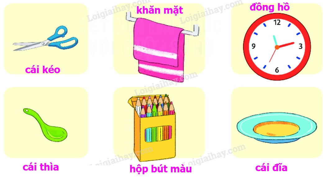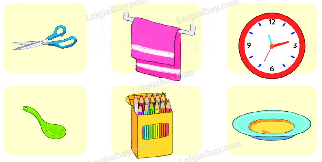 Các đồ vật trong bức tranh là: cái kéo, khăn mặt, đồng hồ, cái thìa, hộp bút màu, cái đĩa