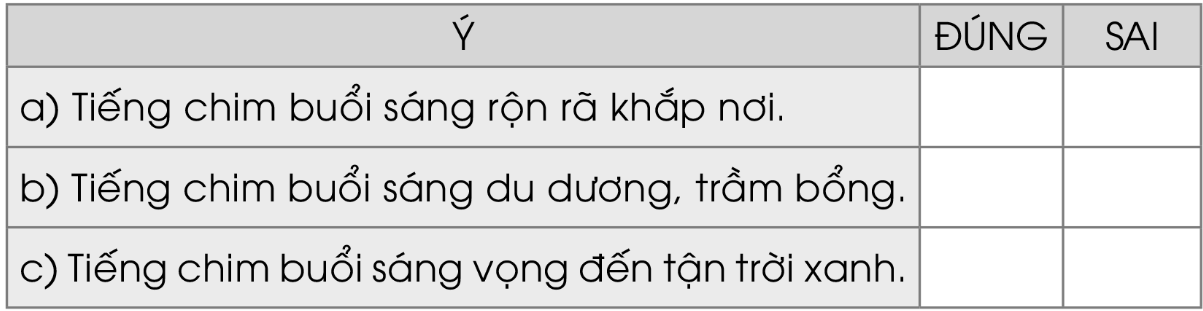 Bằng cách lặp lại liên tục hai từ “tiếng chim”, bài thơ diễn tả điều gì? Đánh dấu √ vào ô thích hợp