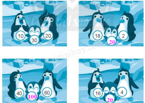 Tính tổng hai số ghi trên các chú chim rồi điền số thích hợp vào chỗ chấm.