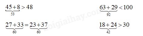 Tính tổng các phép cộng, so sánh hai vế rồi điền dấu thích hợp vào chỗ chấm.