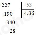 Vậy  227 : 52 = 4,36 (dư 0,28).