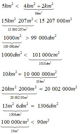 1m2 = 100dm2;               1dm2 = 100cm2;              1km2 = 1 000 000m2.