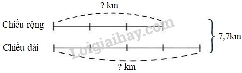 – Tìm tỉ số của chiều dài và chiều rộng: \(\dfrac{1}{2}\) chiều dài bằng \(\dfrac{2}{3}\) chiều rộng, hay \(\dfrac{2}{4}\) chiều dài bằng \(\dfrac{2}{3}\) chiều rộng, từ đó coi chiều dài gồm 4 phần bằng nhau thì chiều rộng gồm 3 phần như thế.