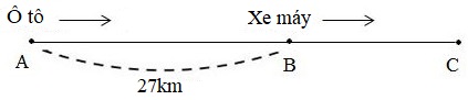 Bài 4. Một xe máy đi từ B đến C với vận tốc 36km/giờ. Cùng lúc đó một ô tô đi từ A (qua B) đến C với vận tốc 54km/giờ. Biết rằng AB = 27km. Hỏi sau bao lâu thì ô tô đuổi kịp theo xe máy?