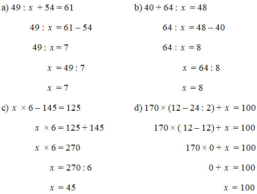 c) \(x\) × 6 – 145 = 125                                  d) 170 × (12 – 24 : 2) + \(x\) = 100