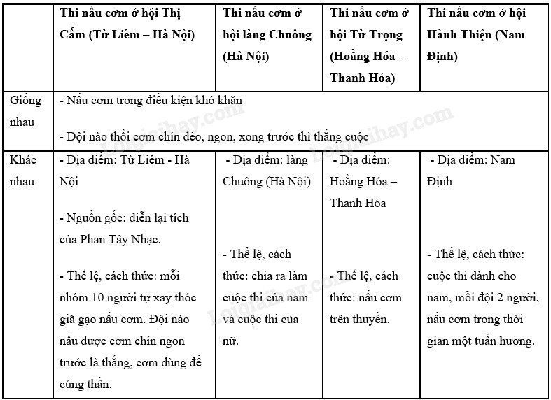 (Câu hỏi 3, SGK) Chỉ ra những điểm giống nhau và khác nhau trong hội thị thổi cơm của các địa phương được nói tới trong văn bản.