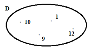 Ta có các số trong vòng tròn là \(1,9,10,12\) nên tập hợp \(D = \left\{ {1;9;10;12} \right\}\).