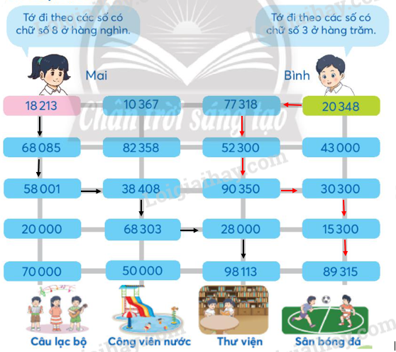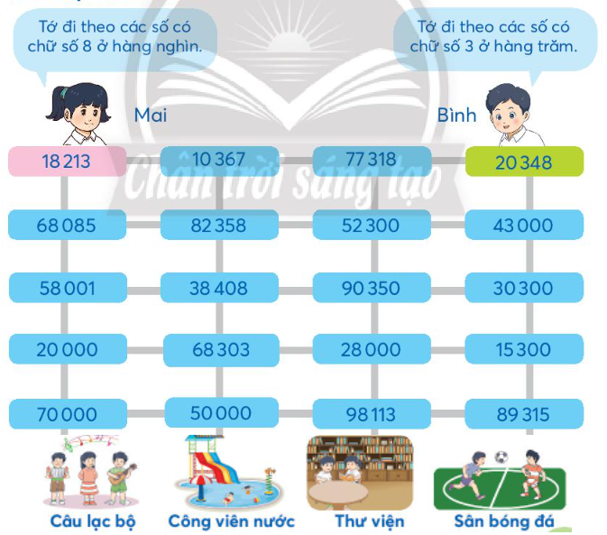 Xác định các số có chữ số hàng nghìn là 8 và các số có chữ số hàng trăm là 3 rồi tìm điểm đến cho mỗi bạn.