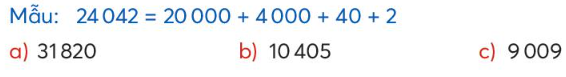 Xác định giá trị các chữ số theo hàng rồi viết số thành tổng các chục nghìn, nghìn, trăm, chục, đơn vị.