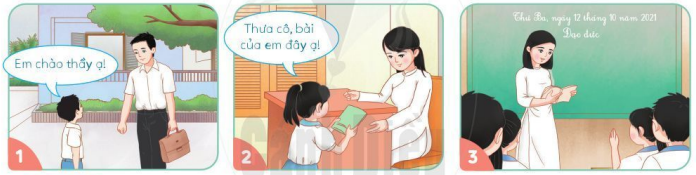 Cách đưa và nhận sách vở từ thầy coi giáo: Khi đưa hoặc nhận sách vở từ thầy, cô giáo phải đưa/nhận bằng hai tay, đầu hơi cúi, mắt nhìn thầy cô giáo. Khi nhận lại có thể nói: “Em xin ạ!’’ hoặc “Em cảm ơn ạ!”.