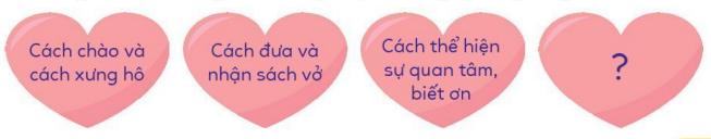 Chào hỏi khi gặp thầy giáo          Đưa vở cho cô bằng hai tay    Giơ tay khi muốn phát biểu ý kiến